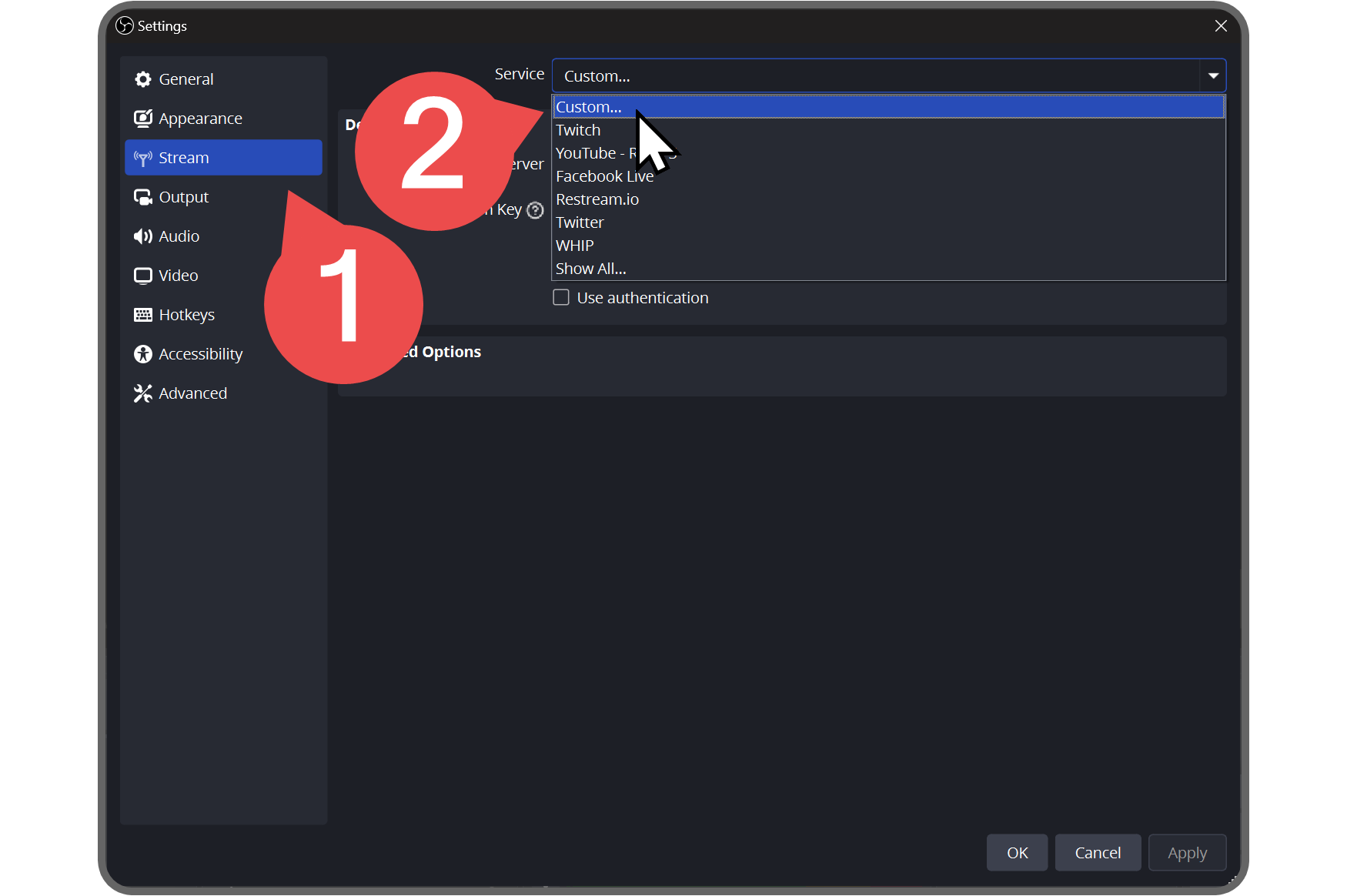 In the OBS settings, navigate to the Stream section and select Custom... from the Service dropdown menu.