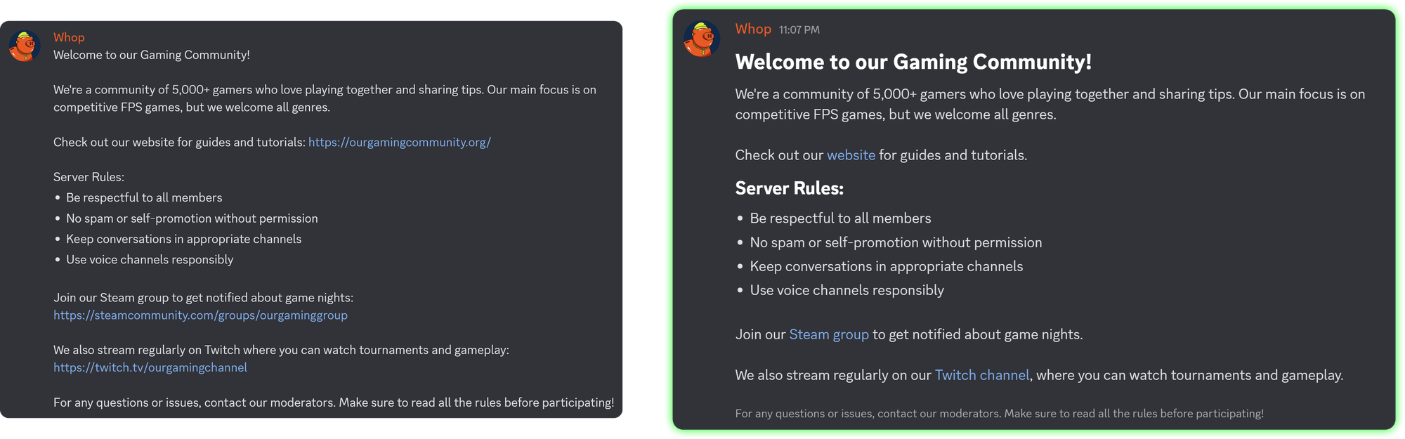 Check out the comparison below. The version on the left does not use Discord formatting. As you can see, the links are long URLs, and there are no headings or subheadings.