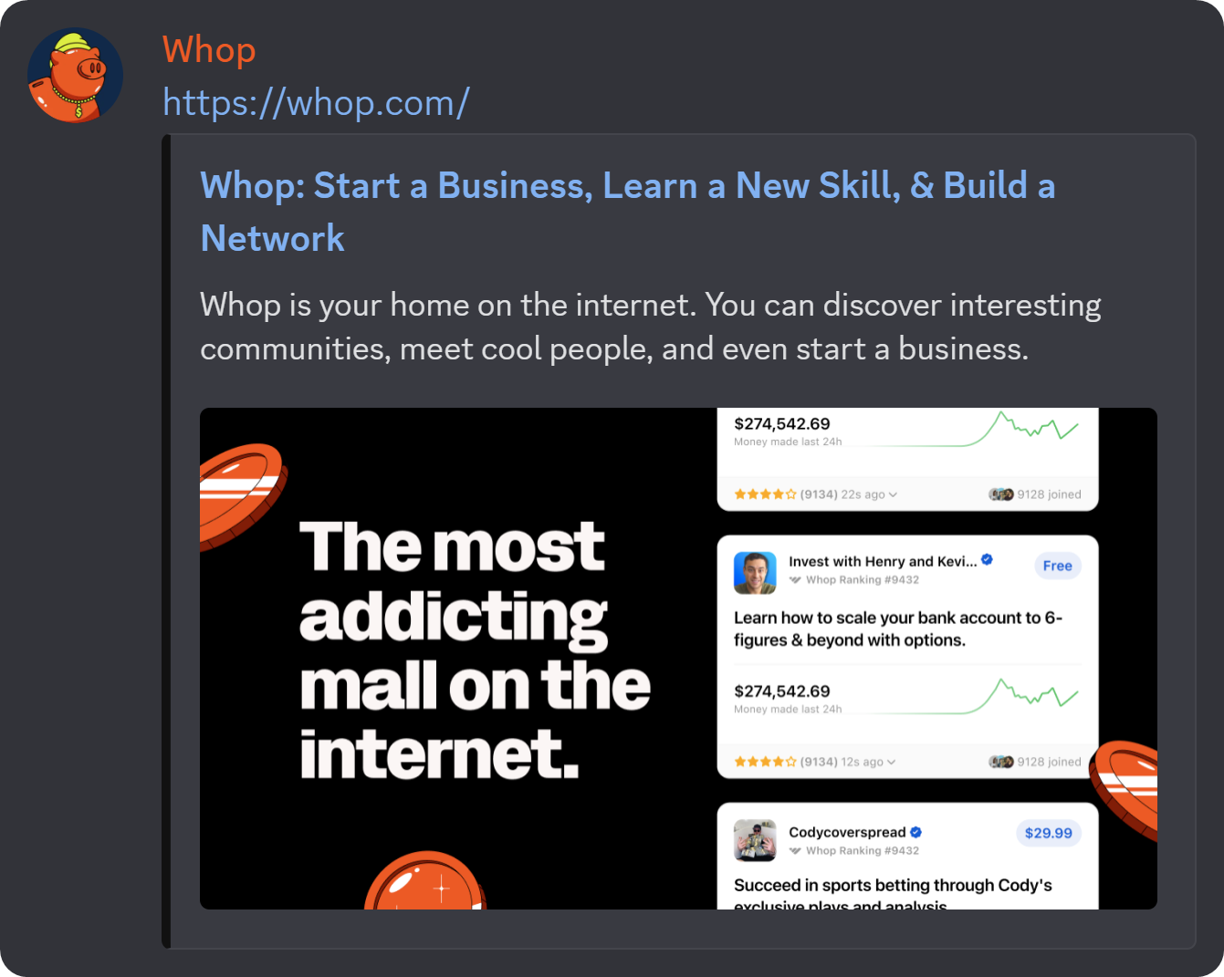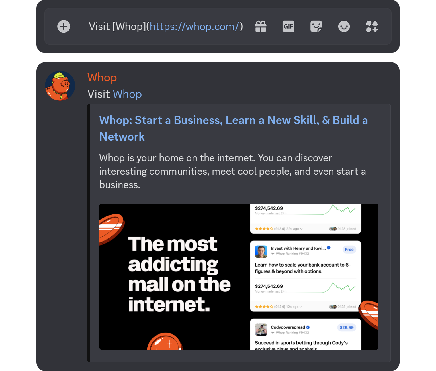 If you want to avoid the link embed from showing up in the first place, you can surround the link with less-than and greater-than signs like this: <https://whop.com/>