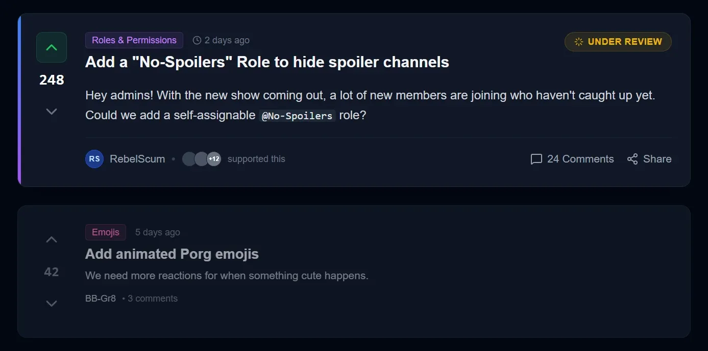 For example, a couple of days ago one of my members submitted a suggestion about changing a role's color. They simply didn't like the color, and many people agreed with it (we can see this thanks to our suggestion system that has a voting feature).