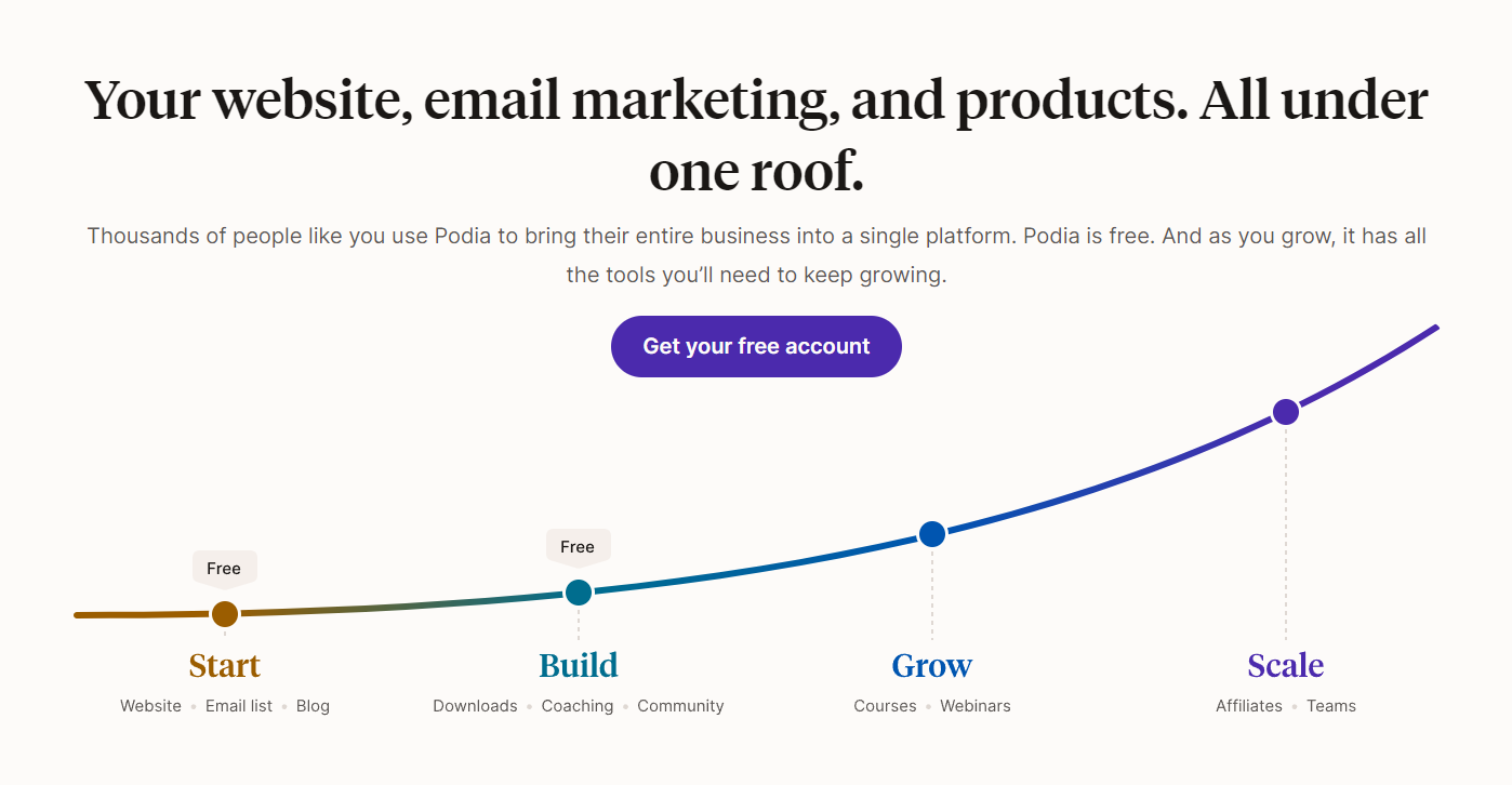 Podia is an online community software that specializes in email marketing and ties that together with a website builder that allows you to build a distinctive, albeit template-driven, feel for your brand that stays consistent across marketing channels.