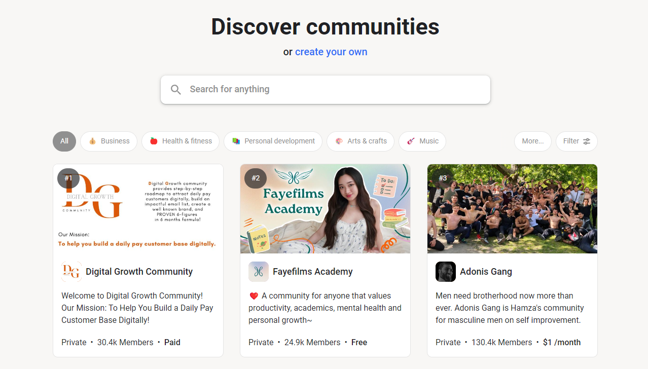 Best For: Creators who want to build their new community from scratch.