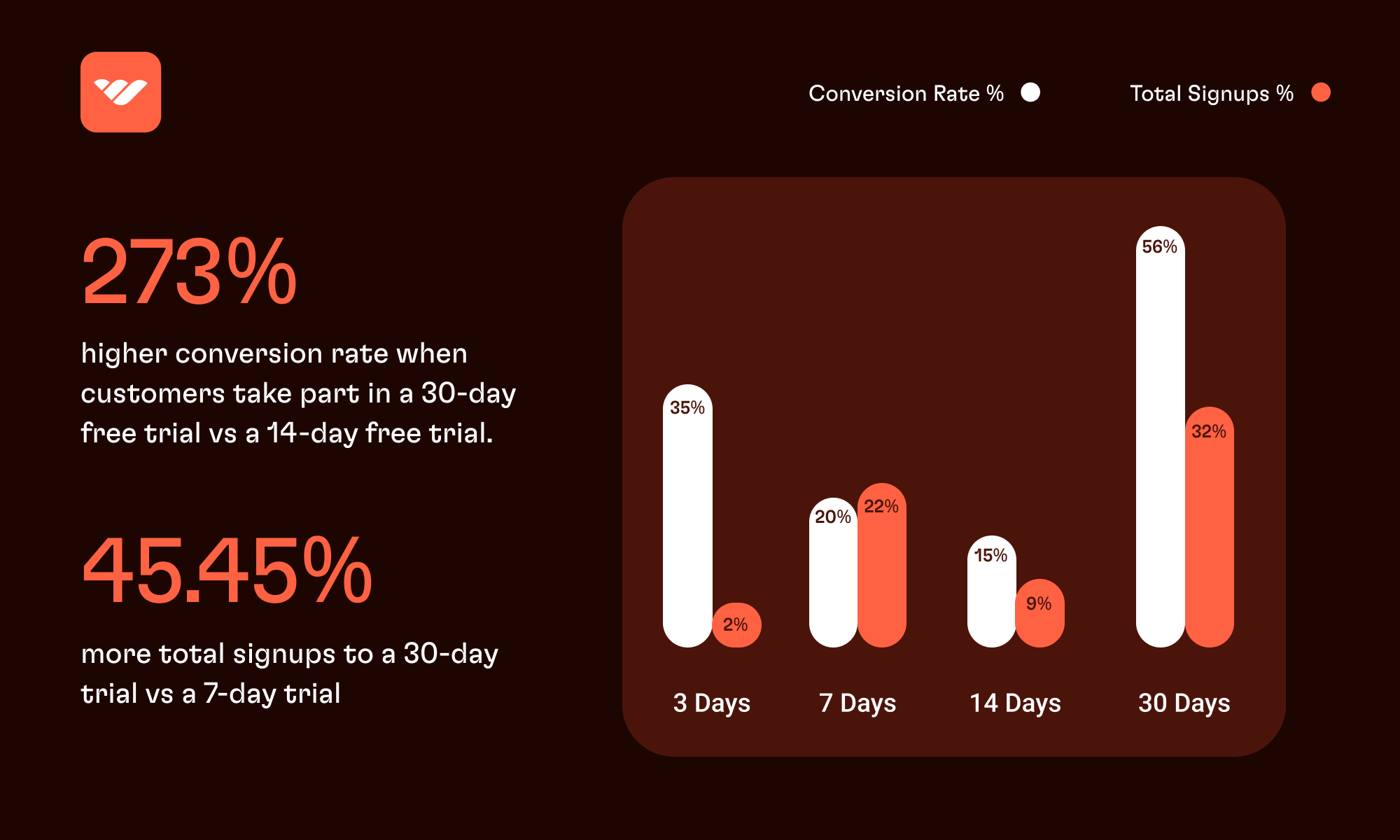 | Free Trial Length | Total Signups % | Conversion Rate % |