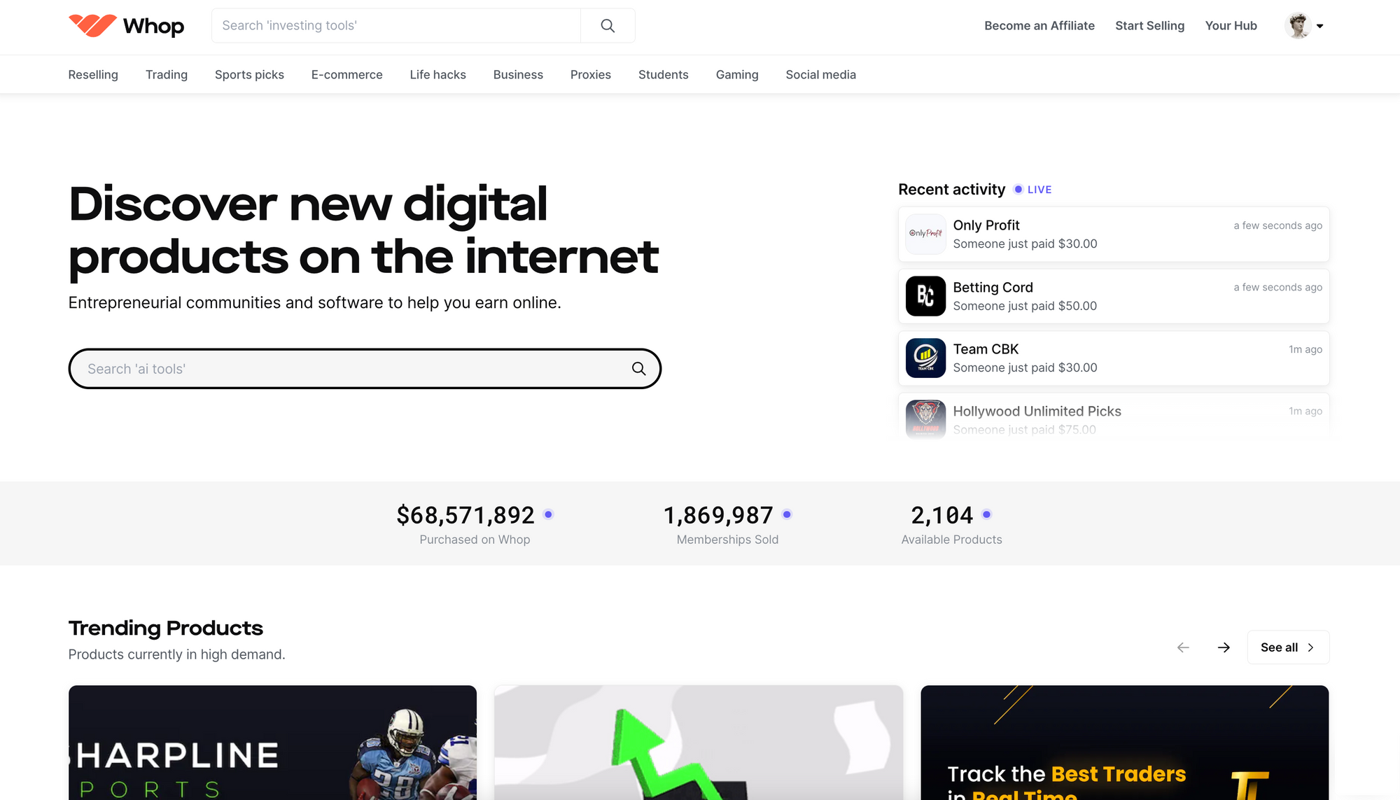 Get discoverable on the Whop Marketplace to put your business in front of more than one million monthly visitors! Marketplace companies are searchable on Whop.com and appear in top charts and category sections of the website. To get on Whop Marketplace, submit your application on the product page in the business dashboard.