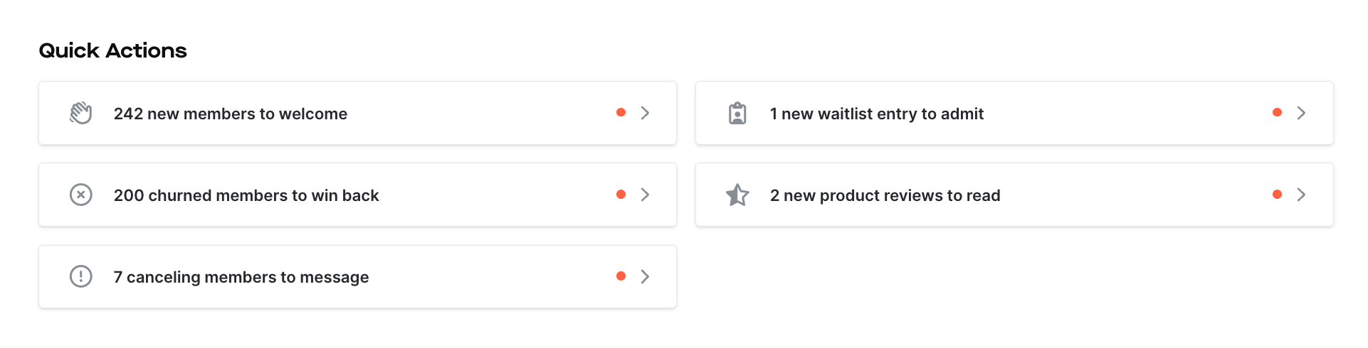 Quick Actions are recent changes to your community, such as new signups, affiliate referrals, cancellations, and churned members. Clicking into quick action on the homepage opens the list of these members, perfect for systemizing outreach to churning members.