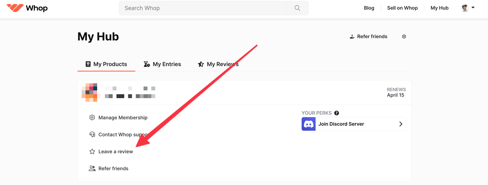 Member reviews display on your company landing page and are pivotal in increasing cart conversion rates. The more 5-star ratings you receive, the more impressive your landing page looks to new customers. Reviews also factor into your Whop Marketplace ranking, so direct any happy members to their hub to leave you.