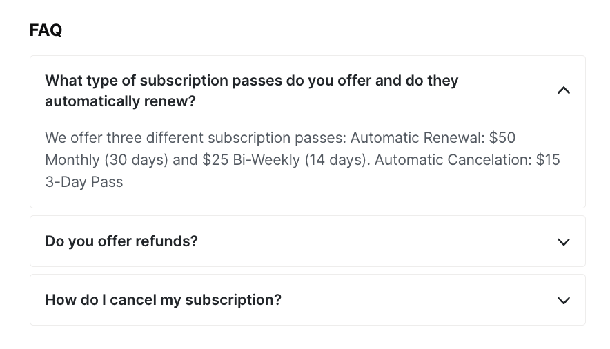 Adding FAQs to your landing page gives your customers an even better understanding of your business at checkout. Your FAQ answers also appear on Google, so utilize them to rank higher in search results! Head to the bottom of the pages tab in the Products section to add FAQs.