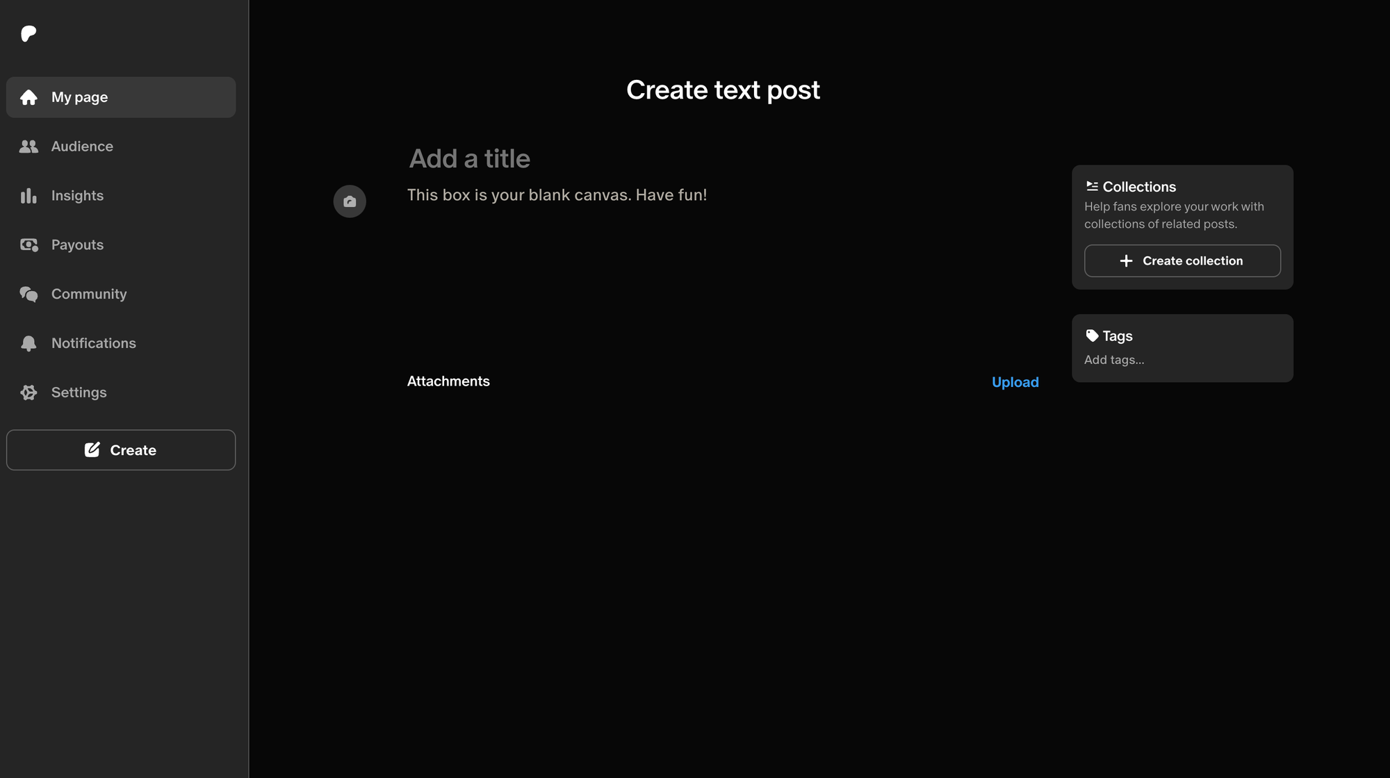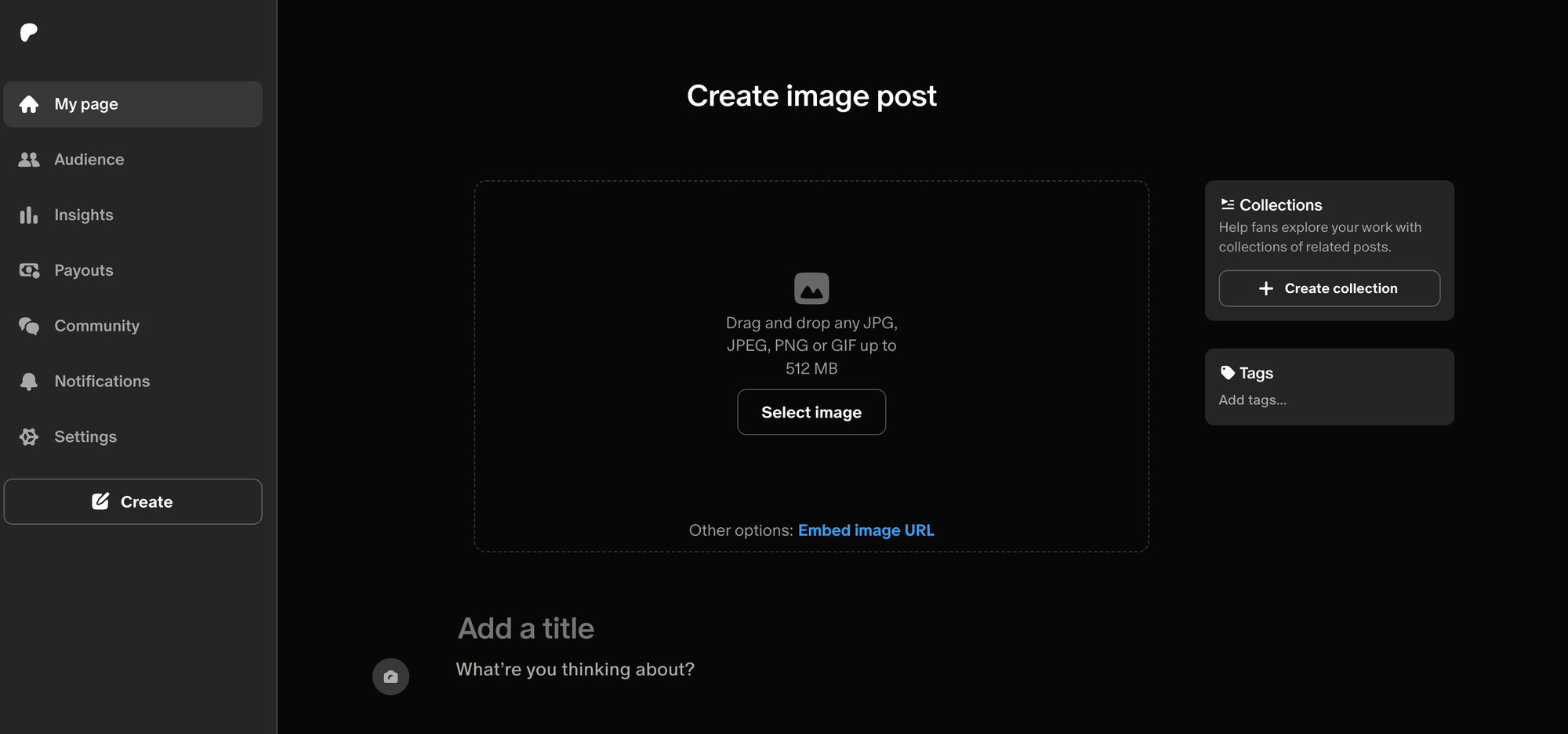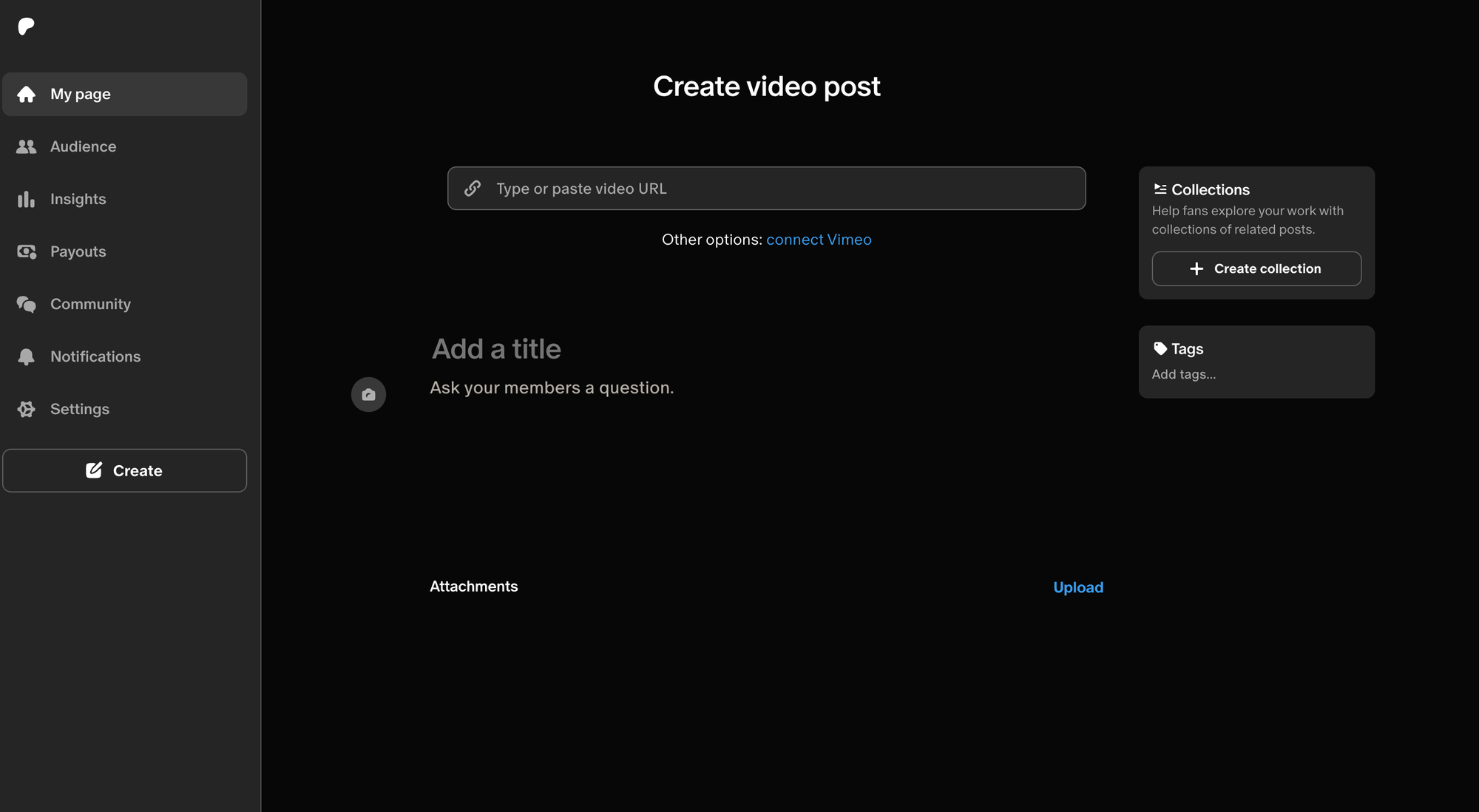 From here, the content upload process is very straightforward. You simply click the type of product that you are uploading and are led to a page where you can upload your content and add a title and description. There is also the option to add this post to a collection and add any relevant tags.
