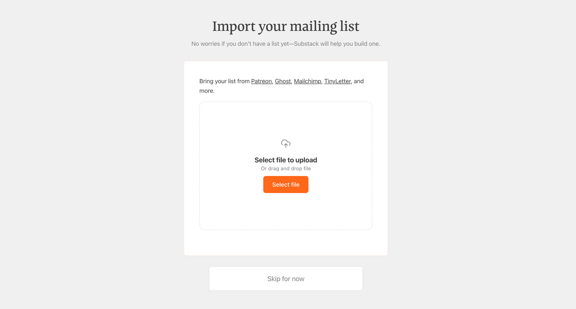 Once you sign up as a creator on Substack you are first directed to import your mailing list and then add your subscribers. However, if you are just getting started and don't have either of these yet, you can skip ahead. This part is pretty clear and Substack makes it easy to begin the setup process.