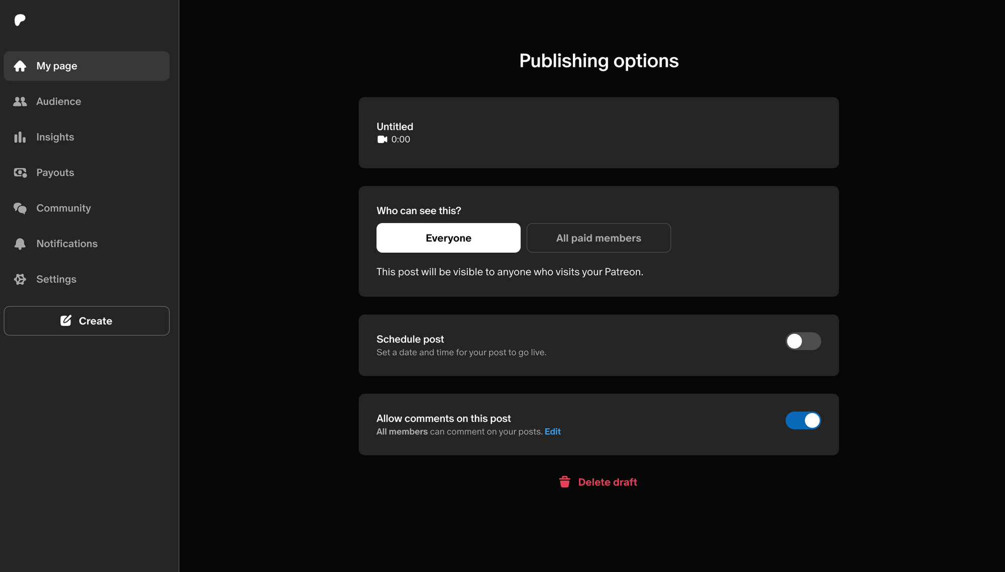 Once you have uploaded your content then you simply publish it. Again, this process is incredibly simple, with only three options here - make this content visible to everyone or only paid members, schedule the post, and an option to allow comments on the post.