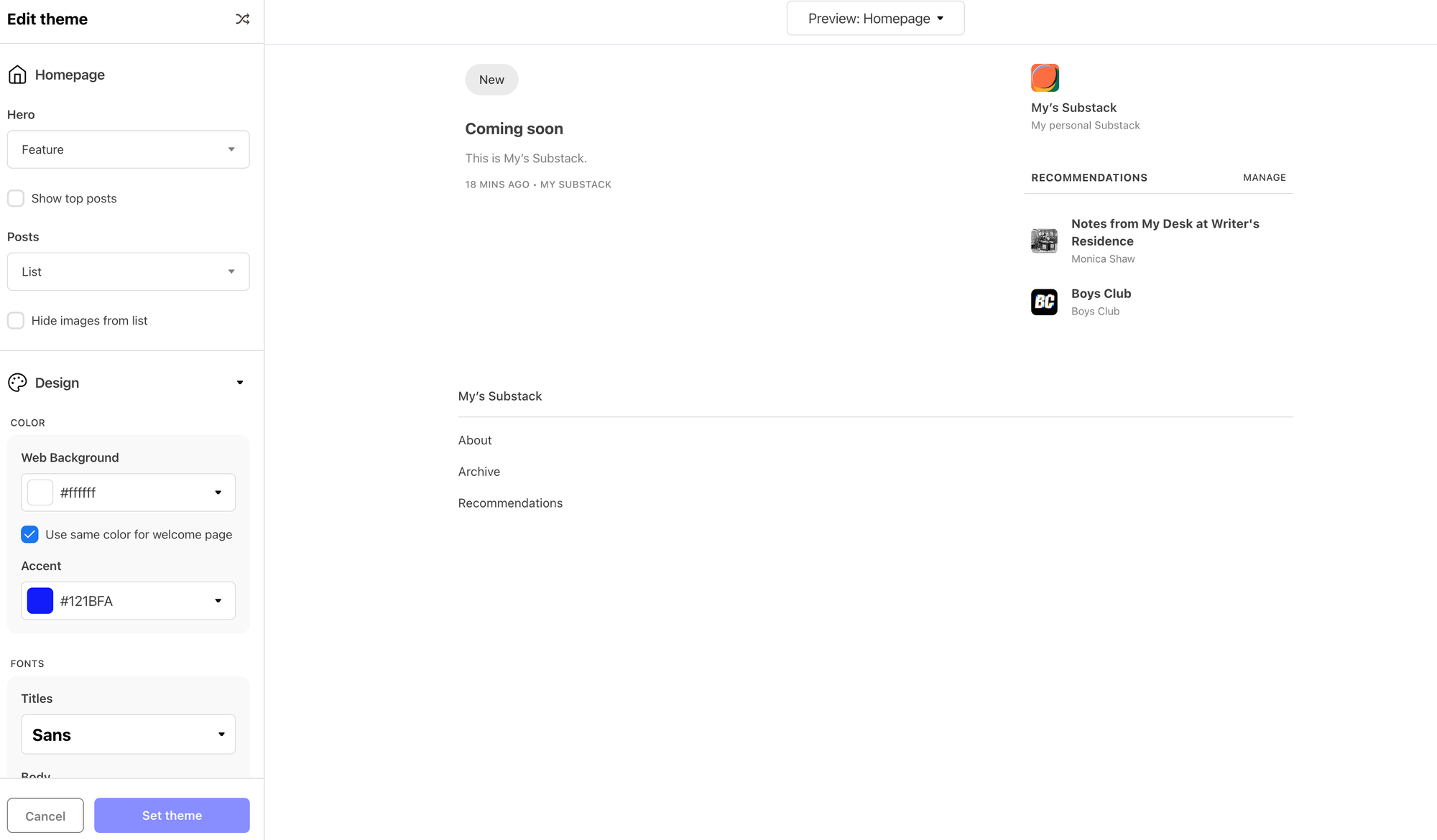 Your Substack home page is highly customizable, with options to change the hero image and how it is displayed, options for displaying your posts (list, grid, or grouped by section or tab), web background color and accent color, and font options for titles and body text.