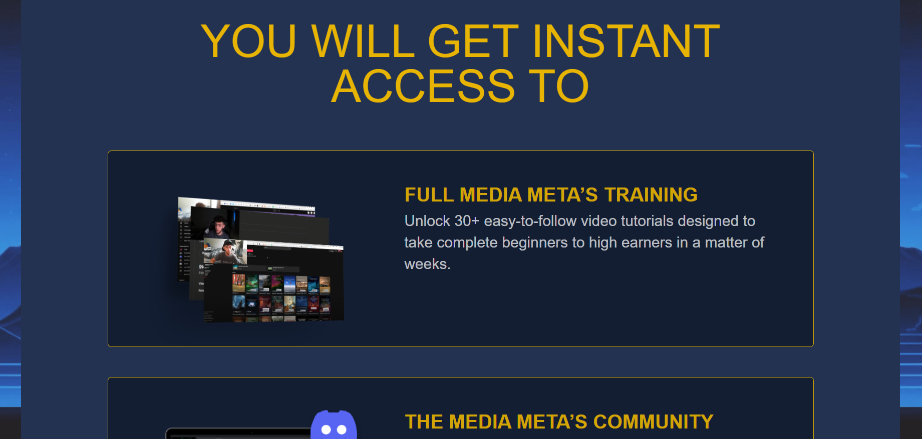 Get a set of educational videos, rebrand them and sell them on platforms like Whop. Get inspired by giants like Media Metas, which includes 30+ videos in its offering, and create products that other creators can use as their own.