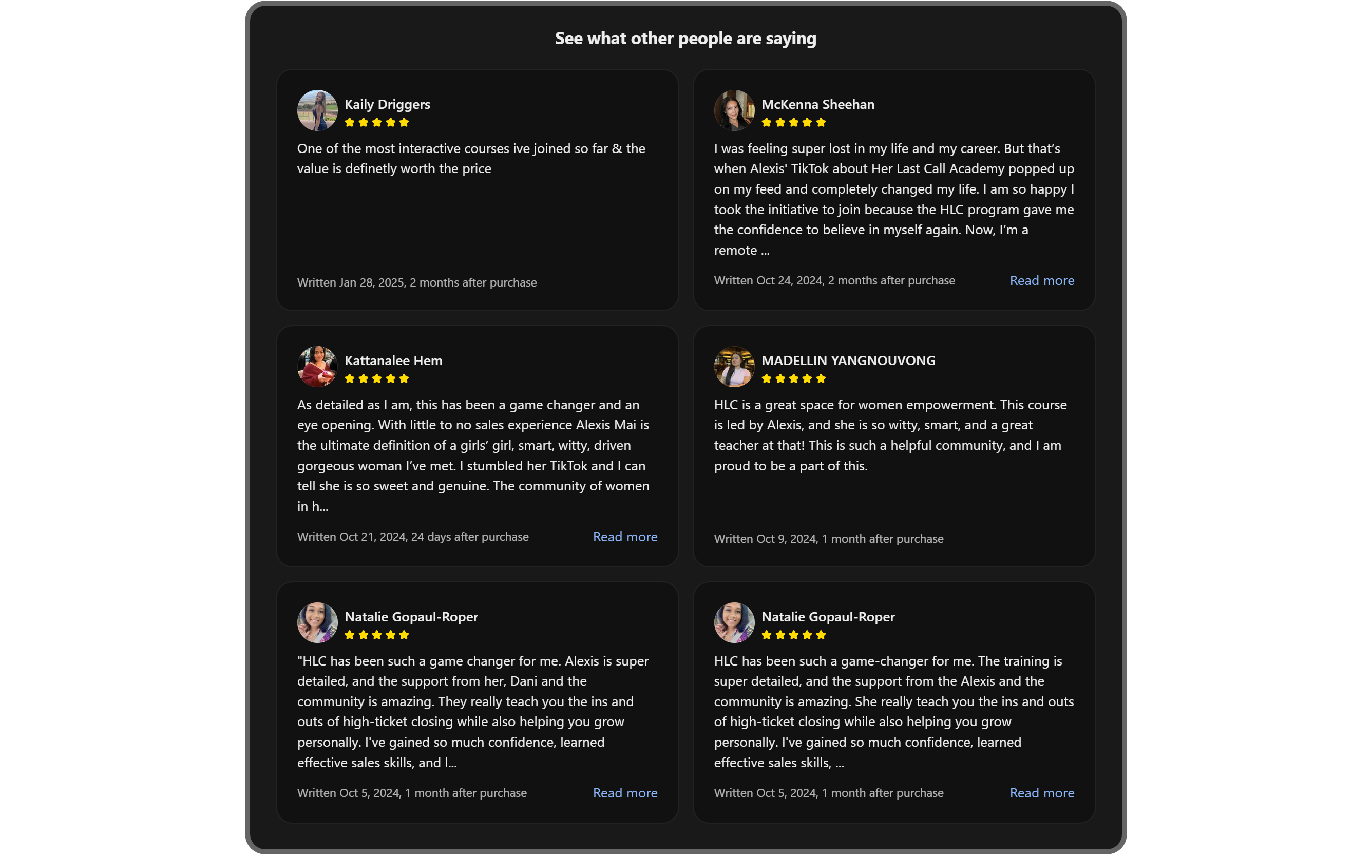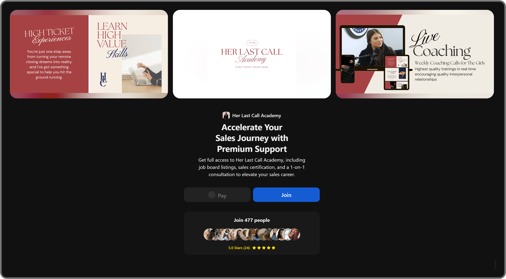 Her Last Call doesn’t just offer courses and live training – it’s a sisterhood for like-minded women in high-ticket sales. An environment that fosters encouragement, collaboration, and support.