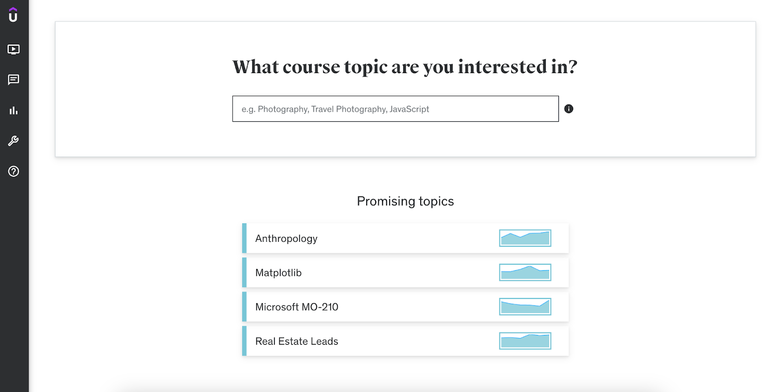 You can teach anything except for the `subjects that are listed as restricted`. Of course, you should choose a subject you're passionate about and have expertise in. Try and search for content around the keywords you've selected to make sure you're not reproducing the same course as others. You can also identify similar course subjects that might be relevant for your intended learners by using Udemy's Marketplace Insights tool.