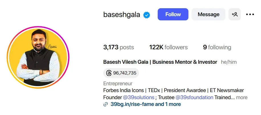 Business mentor and investor Basesh Gala’s bio says, “Trained 100,000+ Entrepreneurs,” which adds a lot of credibility.