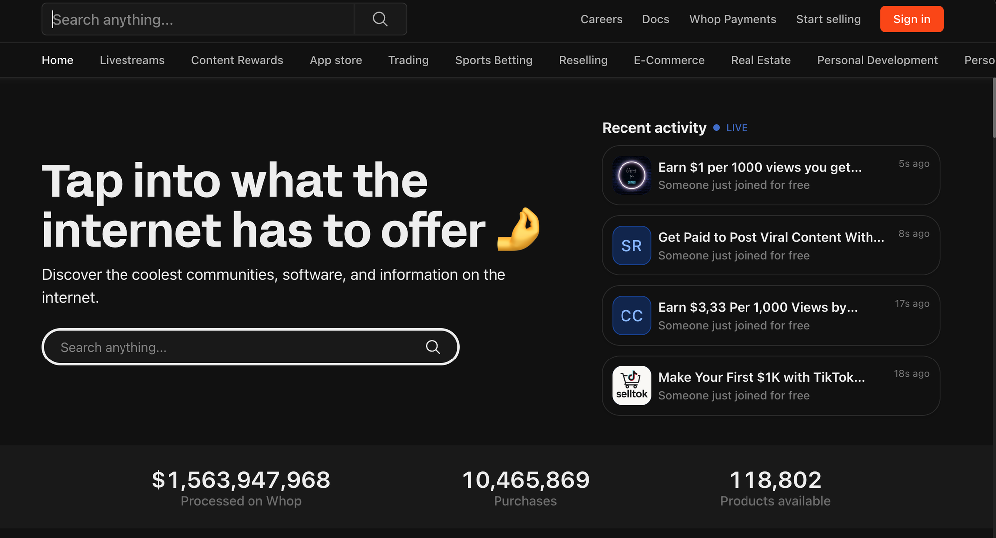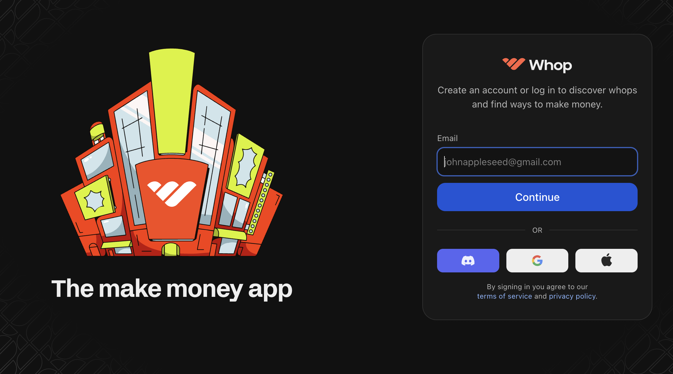 Signing up is super easy. Head over to the homepage at Whop.com and click "start selling".