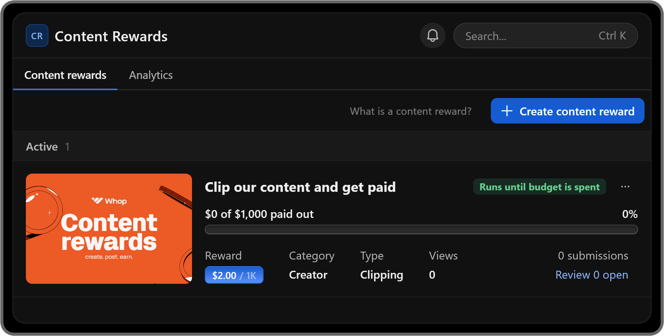 Content Rewards is one of the most powerful growth tools on Whop. With content rewards you can run performance-based ad campaigns that outperform traditional ads, with zero upfront costs and guaranteed results.