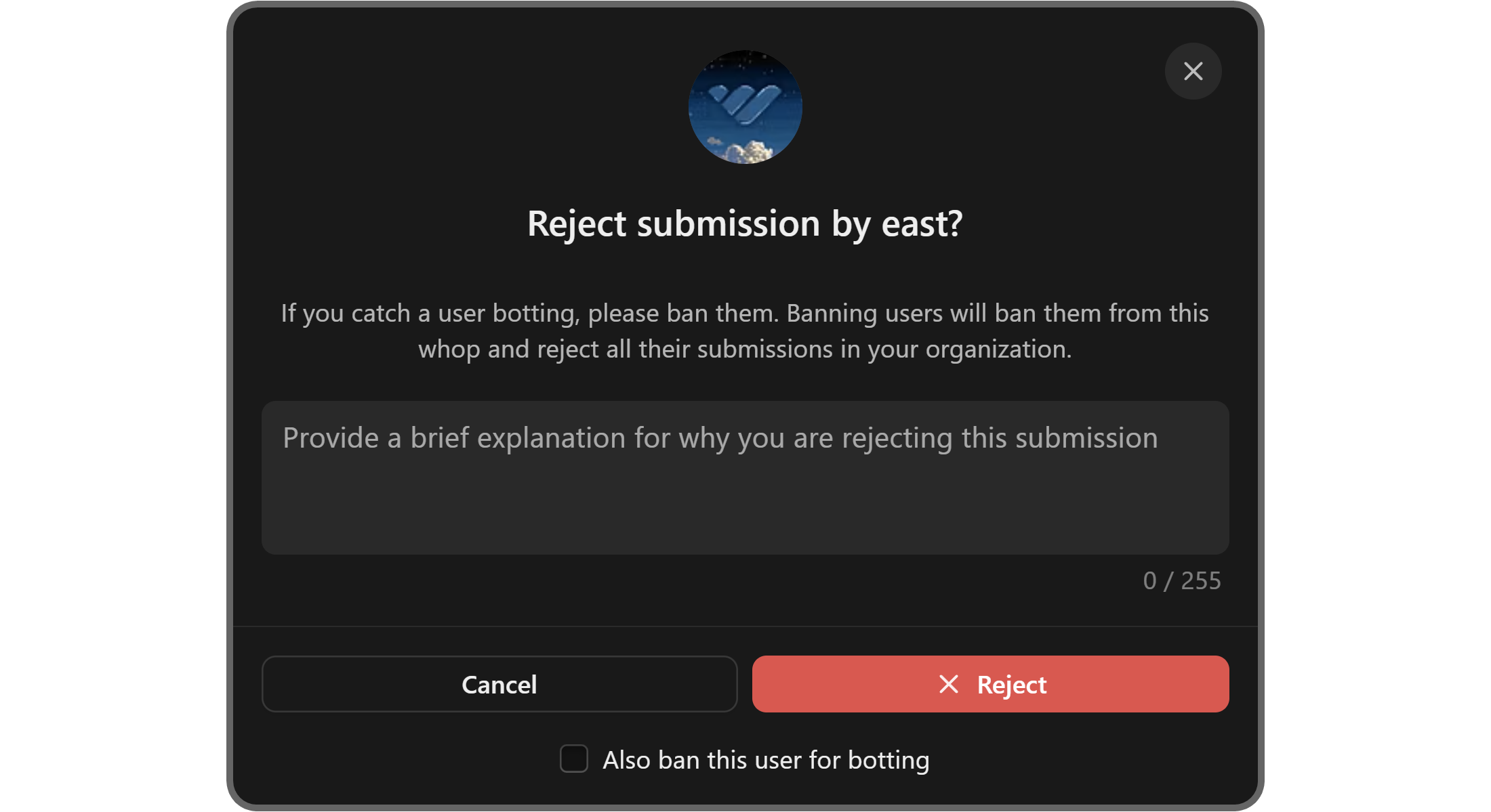 If you click the Reject button, you’ll see a confirmation popup with a text field that prompts you to briefly explain why you’re rejecting the submission.