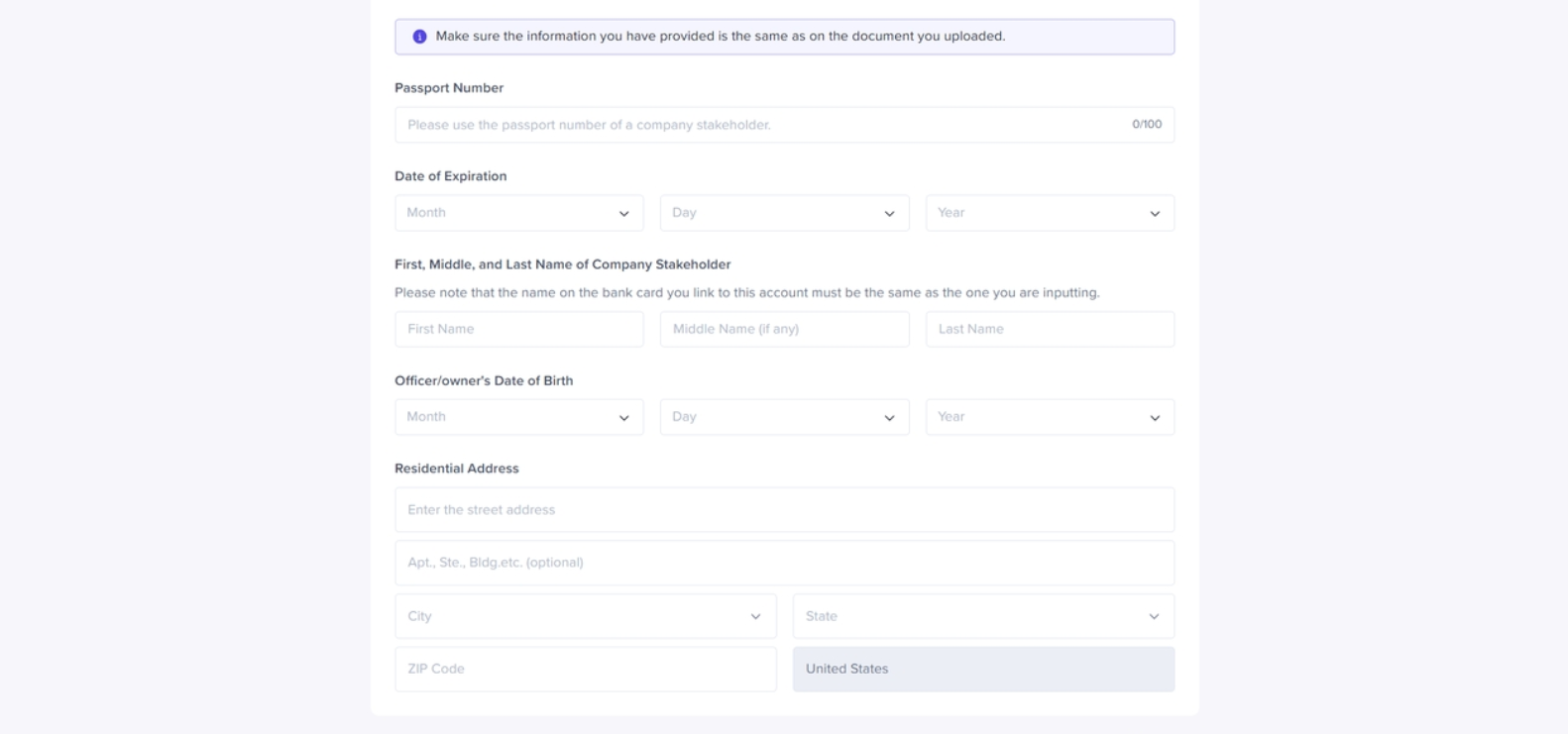 Sole traders in the U.S will need to provide their SSN or ITIN at this stage. They’ll also need to provide their Merchant Category Code to clarify the type of goods or services they offer.