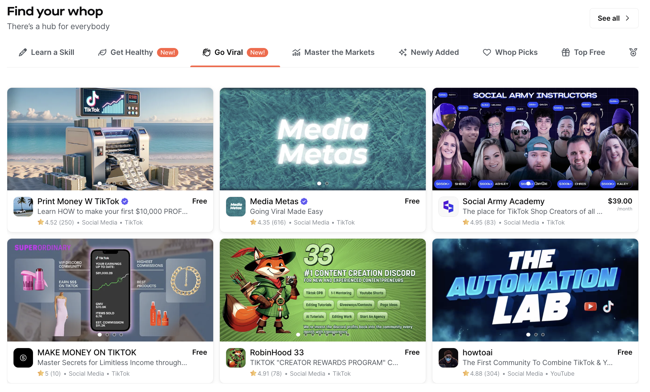 As a business owner, there's no better way to succeed than to get advice from those who have been there before you. The Whop marketplace is home to social media communities led by entrepreneurs who know what it takes to make money with TikTok. With communities, courses, ebooks and tools all dedicated to teaching you how to optimize your TikTok and generate more sales, this is the most hands-on way to increase your TikTok shop sales.