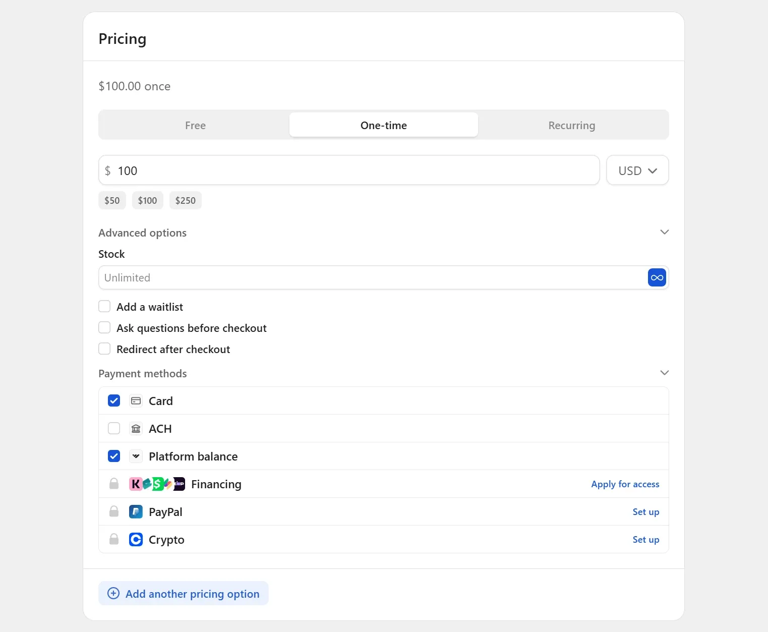 Whop offers two payment types for your products: subscriptions and one-time payments.