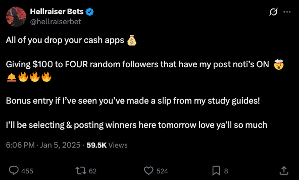 - Grow your social following by sharing research deep dives, big wins, and viral sports content consistently.