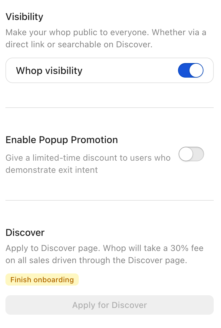 The ‘Apply to Discover’ button can be found at the bottom right of the screen while you’re editing your whop from the 'manage whop' tab.