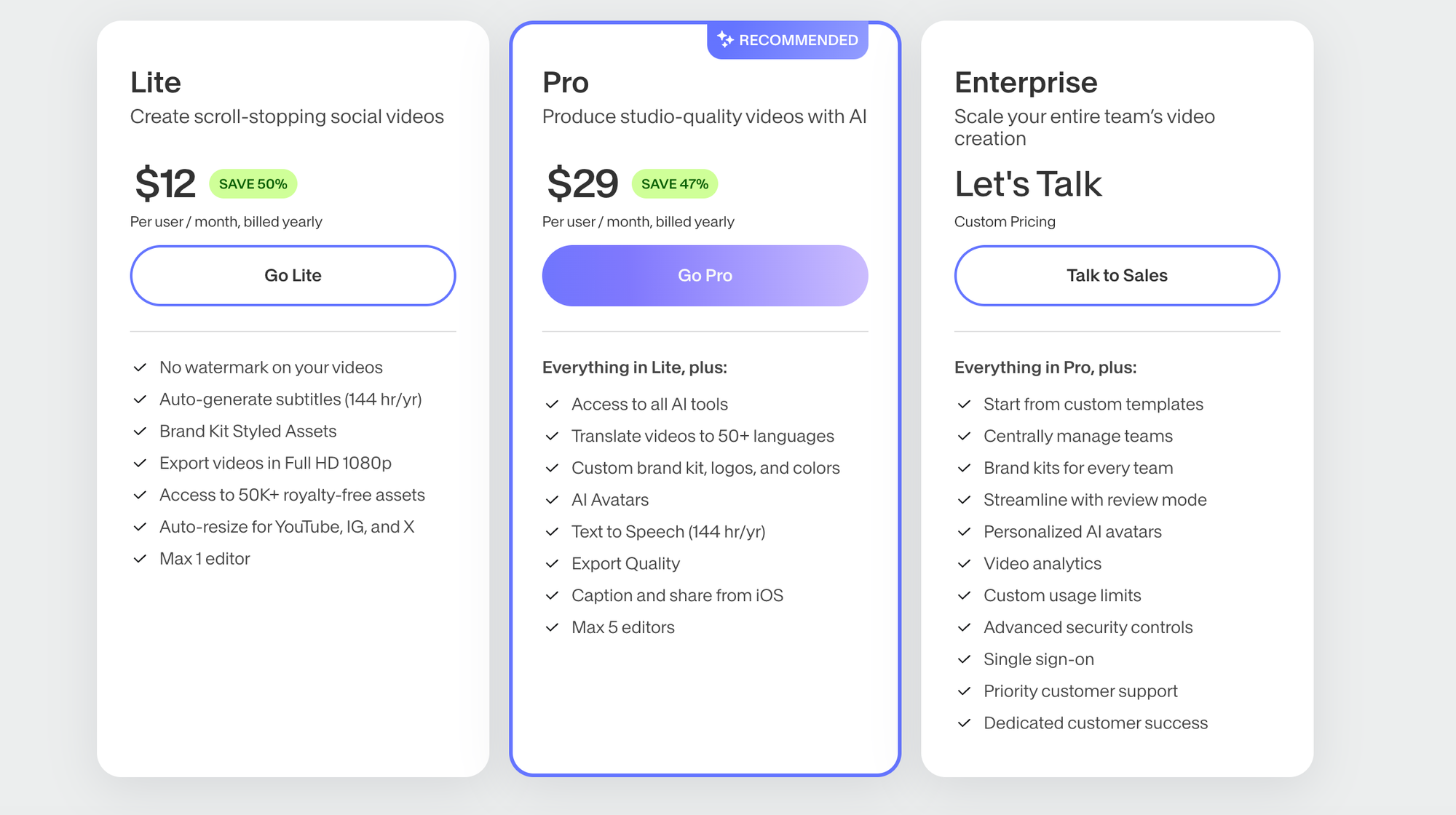 - The Enterprise plan comes with custom pricing. This plans includes everything in the Lite and Pro plans plus custom templates, large team capability, review mode, personalized avatars, AI analytics, SSO, and a dedicated customer success representative.