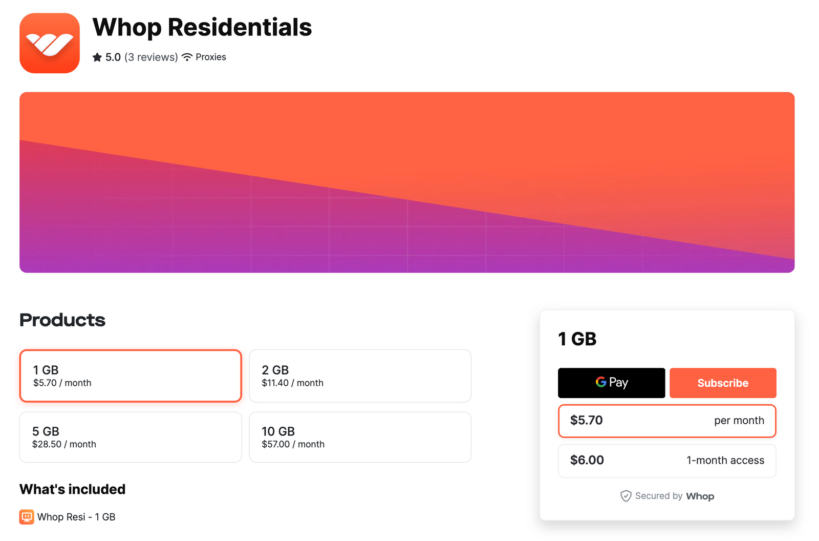 If you’re looking to get the best kicks before they’re gone, you need a sneaker bot and proxy. Whop’s own residential proxy is both effective and budget-friendly; access thousands of residential IP addresses in over 100 countries that are guaranteed to be unbanned by all sneaker sites starting at $5.70/month for 1 GB. Whop sneaker proxies offer fast, secure, and easy to use solutions for all budgets.