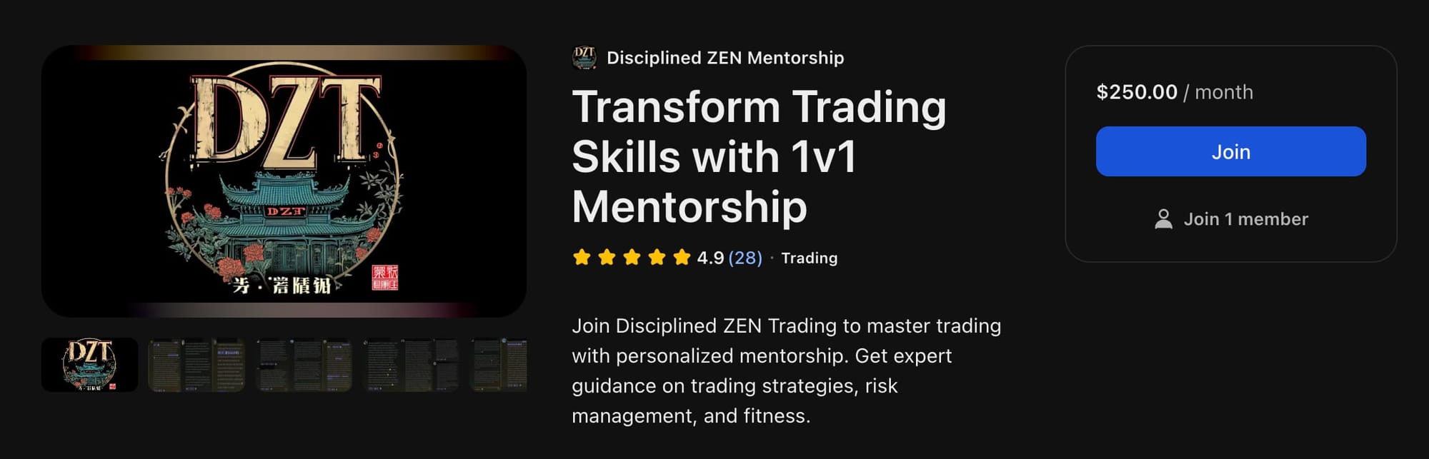 Disciplined ZEN Mentorship blends trading education with personal development, giving members 1:1 coaching, live group trading sessions, and even fitness guidance to keep both body and mind sharp.