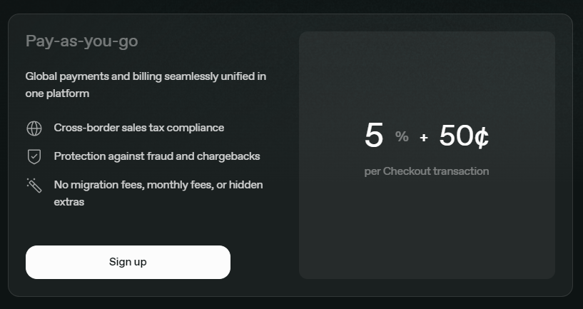 The standard plan costs 5% + $0.50 per checkout transaction. It includes global payments, tax handling, fraud protection, chargeback coverage, and customer billing support.