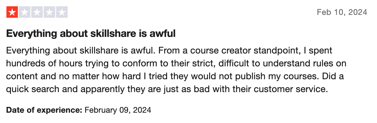 There are plenty of poor reviews from users who have signed up to Skillshare as learners, stating issues with unauthorized payments, poor communication, and poor quality of content.