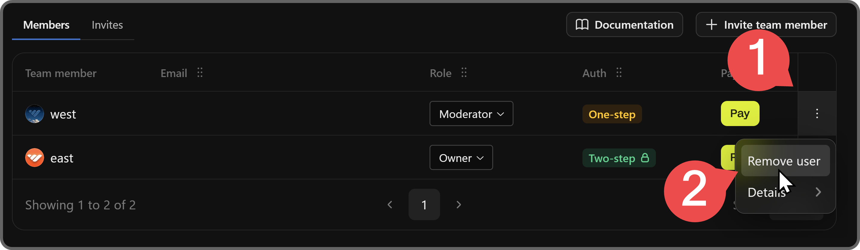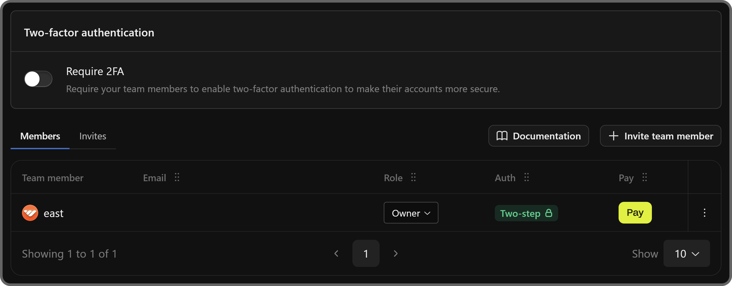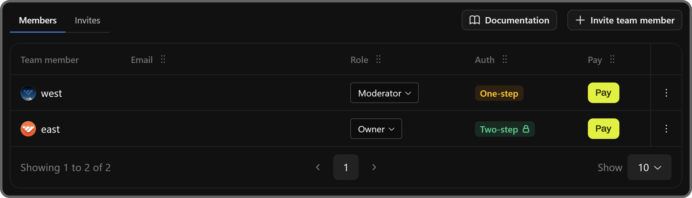 Below that, you'll see a table of your team members with their usernames, emails, role, authentication level (one or two-step), and the pay button. You can also click the Invites button next to the Members tab so see the pending invites.