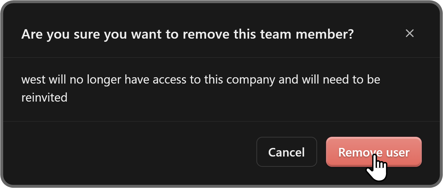Clicking the Remove user button in the confirmation popup will remove the user from your team. Of course, you can invite them back at any time you want.