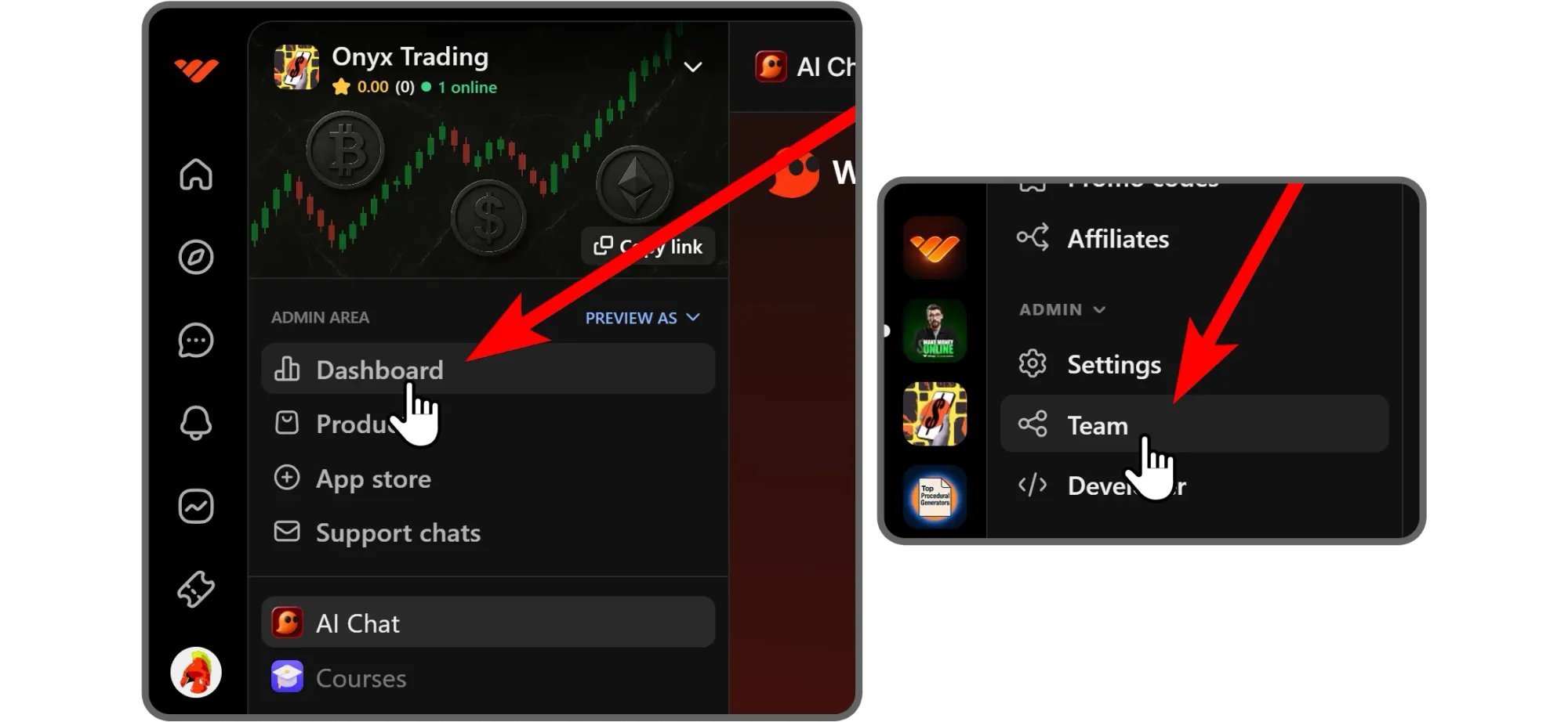 As our first step, let’s click on the Dashboard button of your whop. Once you’re in the dashboard, find the Team button and click on it.