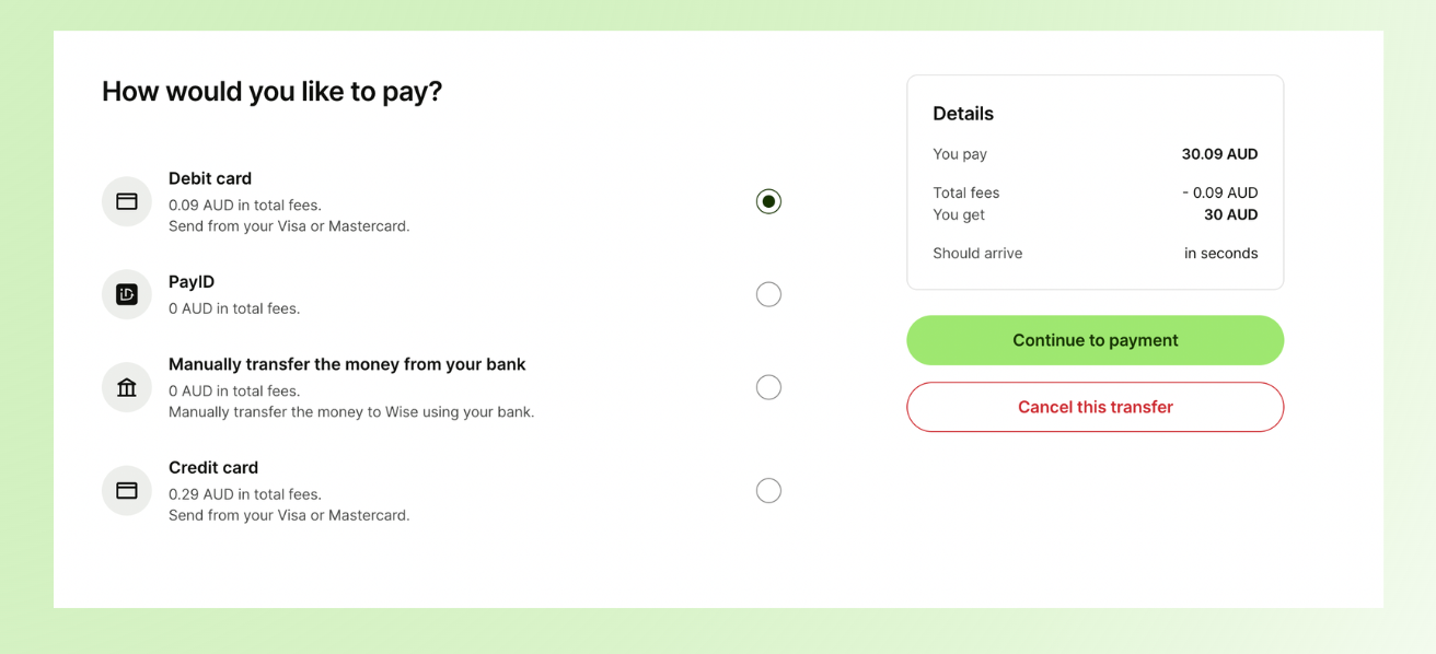 Wise shows you the fee before you confirm anything, so you can choose the cheapest or fastest option based on your situation.