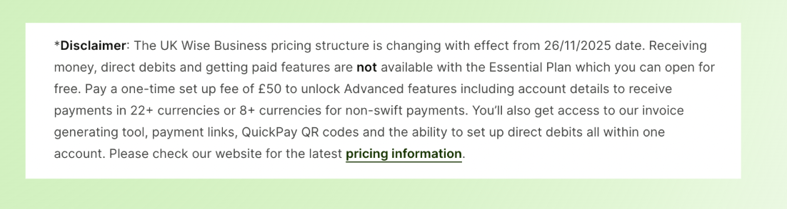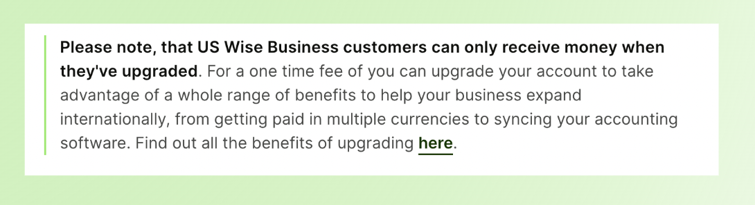 While you can create a Wise business account for free, many 'get paid' features, like invoicing, payment links, and receiving money in multiple currencies, require upgrading to a paid plan (around $65 AUD as a one-off fee). This isn't always obvious during signup, so it can catch new users off guard.